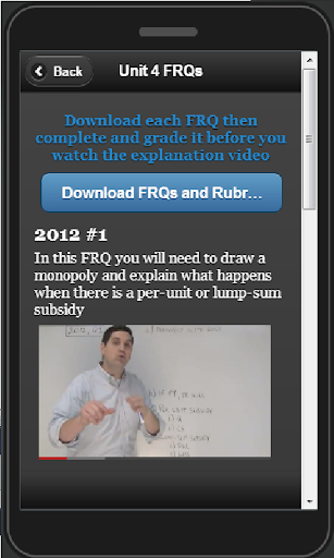 This free version includes unit summaries, key vocabulary, video lessons, AP exam tips, sample Free Response Questions, and sample multiple choice questions. If you love the app please upgrade to the full version of the apps currently offered on Google Play under the names "AP Macroeconomics Review" and "AP Microeconomics Review".