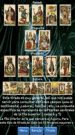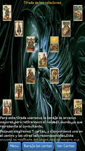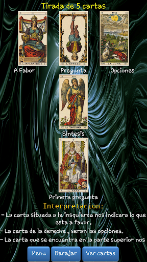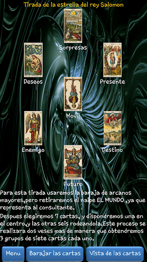Esta aplicación no tiene nada pre escrito , las cartas son mezcladas por el sistema y usted sabiendo su significado podrá interpretarlas para si mismo o para sus amigos.