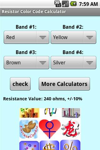 Electrician Calculators provides several handy calculators, including Ohm's law calculator, Calculator for calculating Resistor Values from Color Codes,