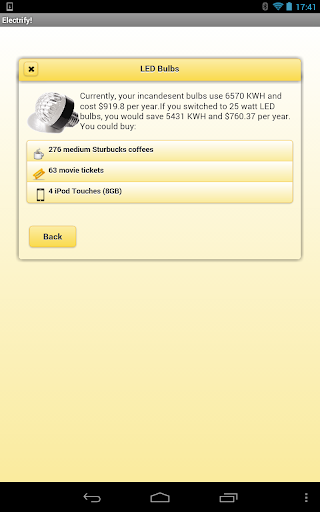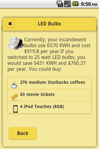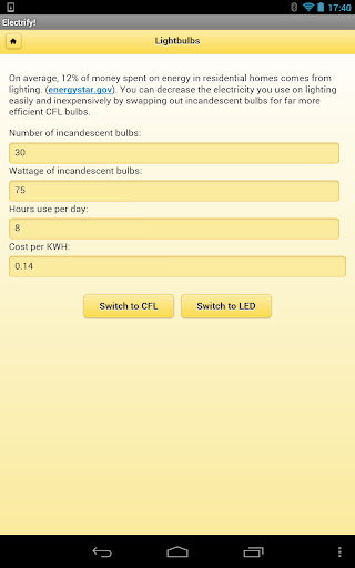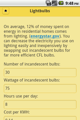 Electrify will help you save lots of cash on reduced electricity and gas bills. It provides calculators, like the one pictured in the screenshot, and the savings add up! Following simple advice, you can start saving hundreds of dollars and KWHs. The information is sourced from the U.S. Department of Energy. You can test the web-app at electrifyapp.com.