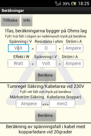 En hjälprede-app. för dig som jobbar som elektriker. Här kan du beräkna Ström, Spänning, Resistans och Effekt med Ohms lag, få grov hjälp med Säkring/Area på grupper, beräkna Spänningsfall i långa (eller om du så vill, korta ledare), beräkna Förimpedans och Utlösningsström samt enkelt notera/dokumentera värden samt dito vid förläggning av Värmegolv.