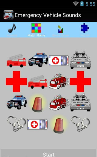 The fun continues in the Emergency Vehicle Sounds activity app with the match game. In this engaging game a variety of emergency vehicle images are shown and then hidden. The player must remember where each image is located and match them to their corresponding images to win.