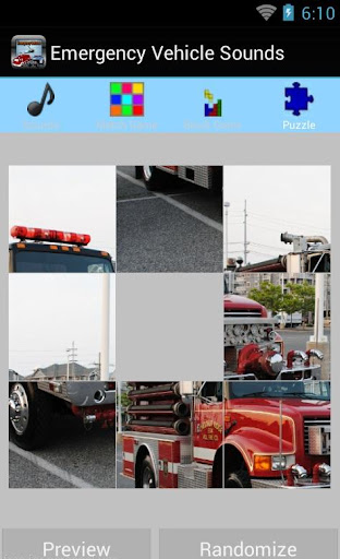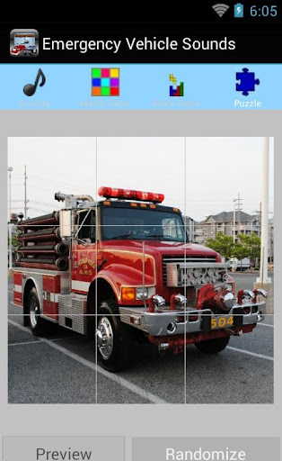 The last component of the emergency vehicle games app is the puzzle. A dramatic image of an emergency vehicle is presented and then scrambled. The player must most the scrambled pieces around to put the puzzle back together again.