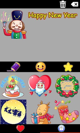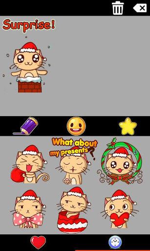 1, Various emoji available, xMas, new year, cute cat, cute girl. just click the one you like and share it to other apps to send it out.