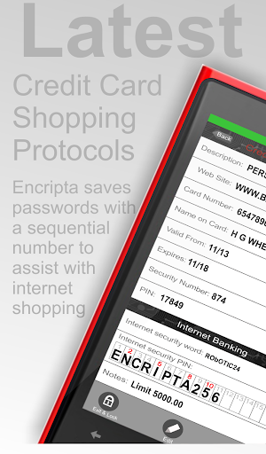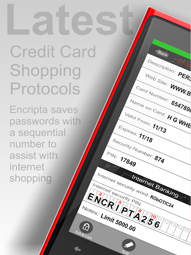 • The latest credit card banking protocols have been included. Encripta saves your credit card internet passwords with a number above each letter. When prompted for example for the 1st, 3rd and 6th letters of your password, Encripta will show the 1st, 3rd and 6th letters of your password.
