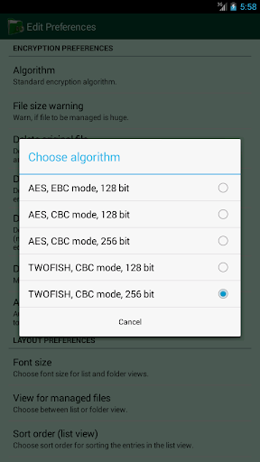 Encryption Manager is a file manager, that offers a comfortable and secure way to keep files with confidential data encrypted using AES or Twofish encryption on your storage (internal storage, external SD card, USB storage).