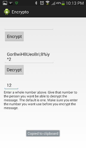 Don't you have secrets to keep! Encrypto is the app for you. Encrypto is an app that lets you encrypt any text making it unreadable. You can then use copy/paste to put the text into a text message or email and only someone using the app with the unique number you choose can decrypt it making it readable again. You can pick any number you want but it's best if it's less than a thousand. The number plays a role in the encryption process so the bigger the message and the bigger the number the longer it will take to encrypt the message. You can change number every message if you wanted to. The encryption is different each different message you send making it almost impossible to decrypt. Using this app you can talk back and forth with your friends or business partners without worry of someone intercepting the message and reading it or picking up your phone and reading it without the unique number to decrypt it it's just rubbish!