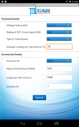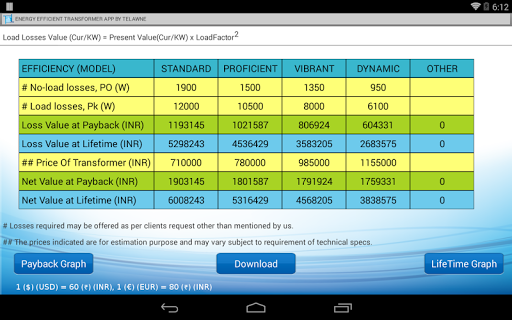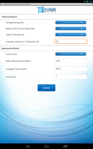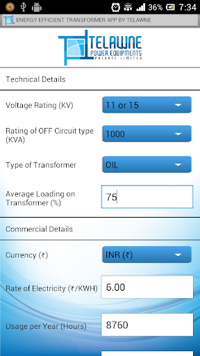 Telawne Power Equipment herewith present the world's first mobile app to select optimum efficient transformer designed with low losses. This unique app offers different variants of transformer on the basis of losses. It can also compare our variants (Models: STANDARD '0' STAR , PROFICIENT '1' STAR, VIBRANT '3' STAR, DYNAMIC '5' STAR) with any other manufacturers. The data available in this app is upto 3000KVA, 33KV Oil Immersed & Dry Type Transformer.