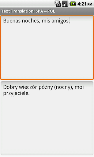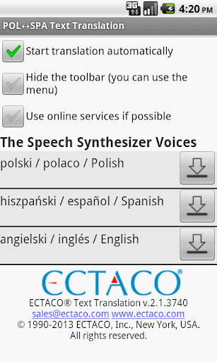 The Ectaco English - Spanish - Polish Full Text Translator for Android pronounces any text and its translation in any of the languages using the most advanced TTS (Text-To-Speech) voice system.