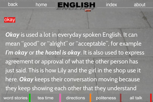 This app helps to bridge that gap. It consists of three short videos of English speakers, one is an introduction and the other two are real, everyday situations. They are out and about in London, talking to people they meet. None of these people are actors. None of the conversations are scripted. These are simply edited clips of real talk, with real accents and at normal speed.