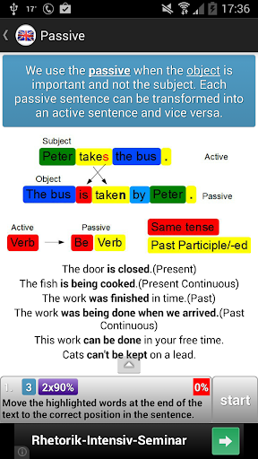 You can immediately apply in practice, what you have read and you'll get feedback instantly. In all tasks English example sentences are used. The topics cover at the moment an intermediate grammar. There are currently over 1000(20-60 for each task) sentences for the exercises available. If you do not know a word in your language, translations are available from a database.