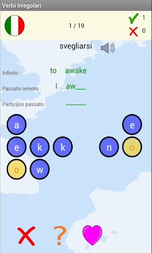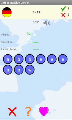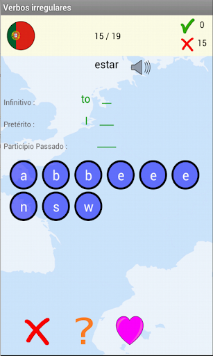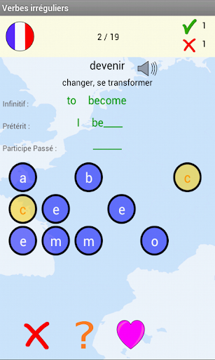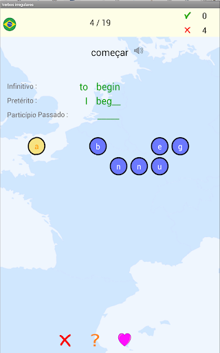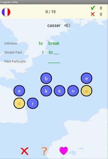 The goal of this game is to put the letters of the hidden English Irregular Verb in the right sequence. When the verb is found, the conjugation of the English Irregular Verb is displayed at Present and Simple Past tenses. The verbs are pronounced if the corresponding option is activated.