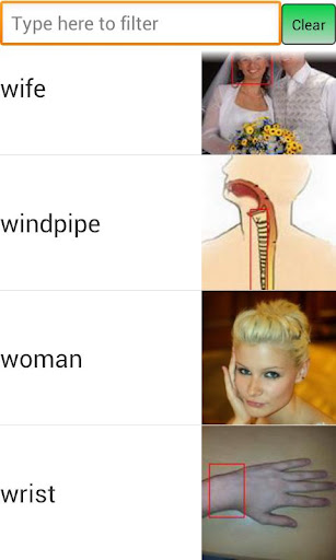 In the List learning mode you can see all the words of the app with their associated photo in alphabetical order. You can filter the list if you want to find a special word. By clicking on a word it will appear in a separate window, so you will see a larger photo and you can play the pronunciation of the word.