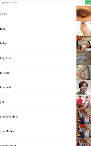 You can learn the words filtered by their categories too. Choose a category from the list to get all the words associated with it. English Picture Dictionary 1 (People) contains two categories: People and Relationships and the Human Body.