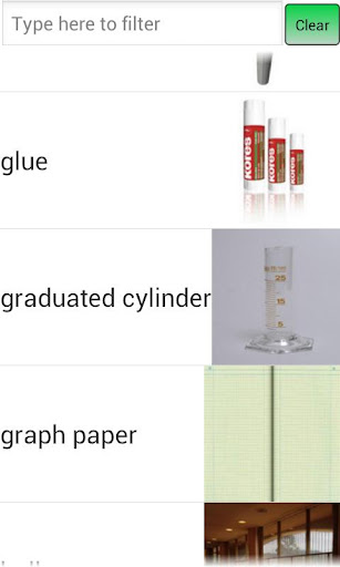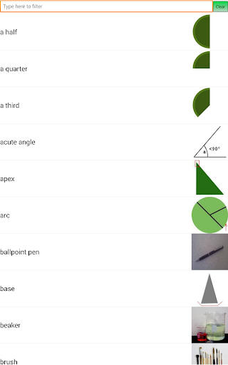 In the List learning mode you can see all the words of the app with their associated photo in alphabetical order. You can filter the list if you want to find a special word. By clicking on a word it will appear in a separate window, so you will see a larger photo and you can play the pronunciation of the word.
