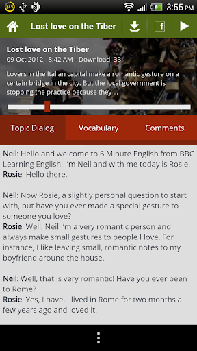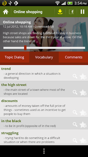 Learn how to speak and improve your English with this English Podcast. This app includes podcast that will teach you skills such as listening to English, understanding basic grammar, vocabulary and idioms, and also public speaking. Each podcast comes with full text to facilitate your understanding of the written language.