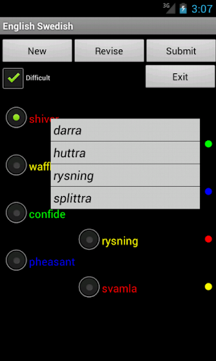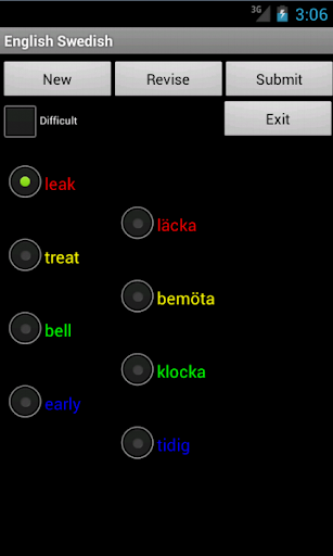 A. Select New, then touch the head word in the left column and it's matching word in the right column. Its colour will change. Repeat this for all words and then select Submit to check the answers