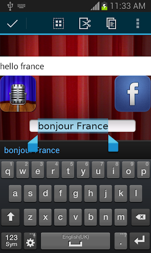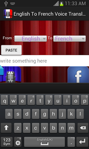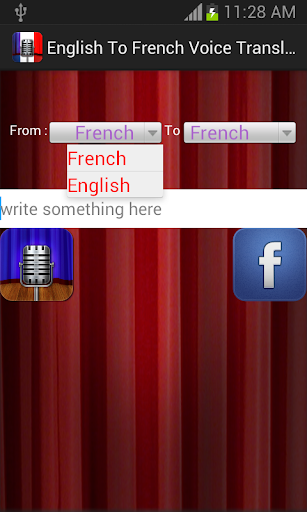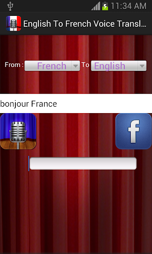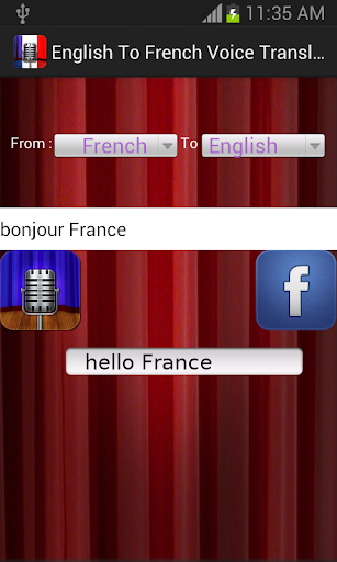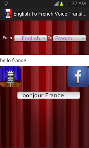 english to french voice translator is a translator app for your android mobile that can translate english words,sentence with nice live voice and text to French words,sentence.it can also translate french words,sentence with live voice and text to english.if you want to learn french than this app will be very helpful for you.or make fun with your friends with French words like “bonjour”.
