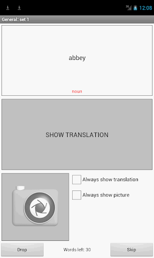 This is a traditional game targeting in-depth word learning. In this game, the same cards as those used in the FlashCards game are divided into 4 groups (4 pockets). At the beginning of the game all cards are located in the first pocket. You turn the cards one by one and, if you know the hidden word, put the card in the second pocket. Keep browsing until all the cards from the first pocket are moved to the second pocket.
