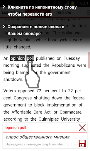 Приложение позволит получать перевод незнакомых слов не отвлекаясь от чтения материала. Более того Вы можете сохранять новые слова в своем электронном словаре.