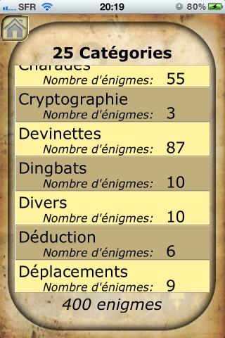 25 Catégories différentes, possibilité de marquer les favoris de voir d'un simple coup d'oeil les énigmes déjà lues ou déjà résolues le tout avec une navigation très simple.