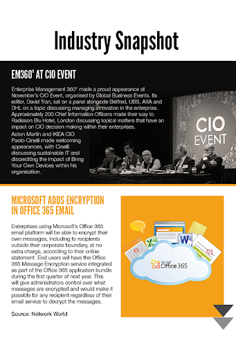 Enterprise Management 360˚ (EM360˚) provides the reader with the latest industry news, interviews, videos and podcasts with key industry leading analysts and the world’s biggest business decision makers. We regularly work with IBM, Microsoft, EMA, Gartner, Emerson and SAP to discuss issues and advice to our readers on the latest trends including cloud computing, infrastructure management, IT security, information management, big data and virtual desktops.