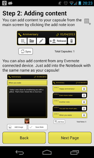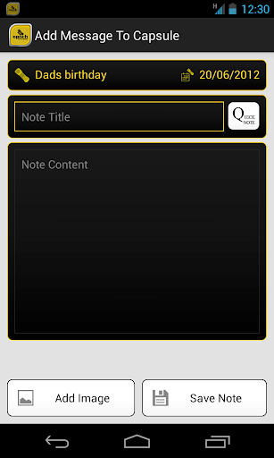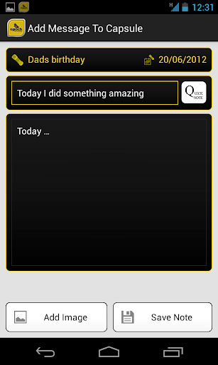Putting content into your time capsule is easy! From the My Time Capsules page you can click the add note icon to add a simple note with an image into your time capsule. Stuck for ideas on what to write? Use the QuickNote feature to access templates to use for your message.You can also add the Epoch Widget to your Android home screen to make it simple to add content to, or view your favourite capsules!