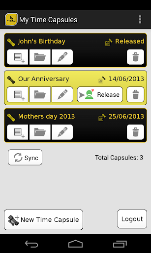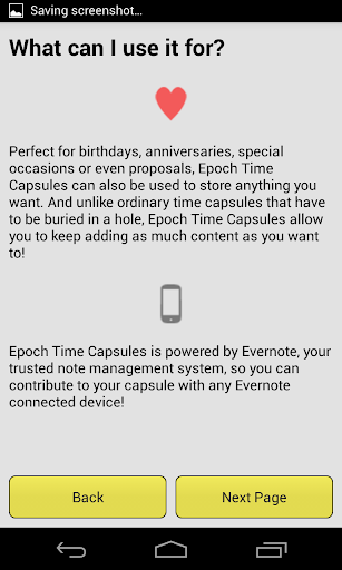 First you need to download the Epoch Time Capsules app. You will also need to create an Evernote account if you do not already have one. Epoch Time Capsules stores all your content on Evernote for safe keeping until you are ready to release the capsule. Creating a capsule in the app is easy. Once you have logged in using your Evernote account, just click the New Time Capsule button.