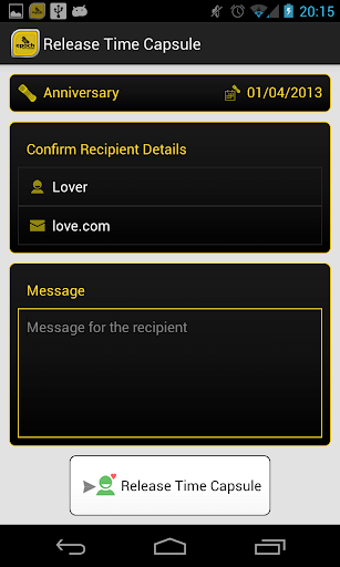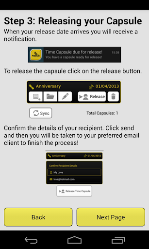 When your release date arrives you will receive a notification from the Epoch Time Capsule application letting you know that your capsule is ready for release. Clicking on the notification will take you into the app. Once inside you will see a new button showing on the My Time Capsules page called Release! This button will take you to the Capsule Release Page where you can add one final message to your capsule before emailing the capsule out to your loved one.