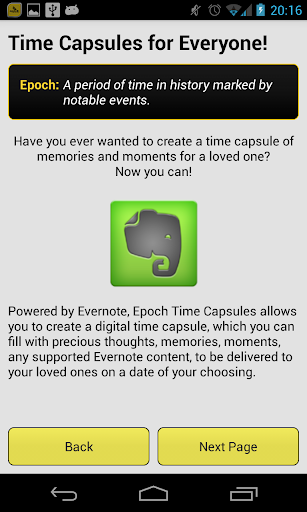 Epoch Time Capsules is an Android app that aims to make it dead simple to create Digital Time Capsules full of memories and thoughts for your loved ones. So what is a Time Capsule? A traditional time capsule is a metal cylinder filled with “historically significant” notes and left in a hole to be recovered at a date in the future. Normally this would be 10, 25, or even 50 years into the future. There are many famous examples of time capsules including the Burbank Time Capsule.