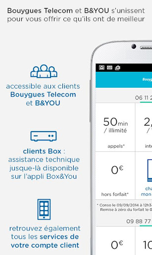 ELIGIBILITE : Toutes nos fonctionnalités sont accessibles aux clients Bouygues Telecom Forfaits mobile, Ideo, B&YOU (nouveau), Bbox et Pro. Le suivi crédit conso et rechargement de compte client sont des fonctions accessibles pour les clients Forfaits mobile Bloqué et Carte.