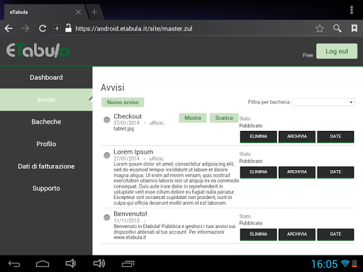 La gestione delle bacheche dal sito di Etabula è semplicissima e permette, oltre che la pubblicazione degli avvisi, anche la modifica di proprietà come ad esempio le informazioni da visualizzare nella parte inferiore del display o le credenziali di accesso per il download dei nuovi avvisi, fino ad aggiornare da remoto la versione dell'App Android installata.