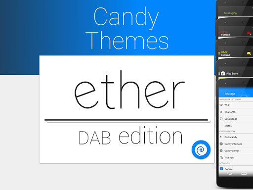 ether (DAB edition) FULL VERSION - "DAB " Dark Action Bar. This theme uses a dark actionbar look with colored accents using colored text and icons per app. There are numerous Icons and imgs changed throughout the UI... all that blend seamlessly with the stock CK/CM UI. For CM 11 users all the holo blue has been removed and for CK and CM users the DAB effect will be a nice change. It uses Stock App icons, but feel free to apply any set of your choice.