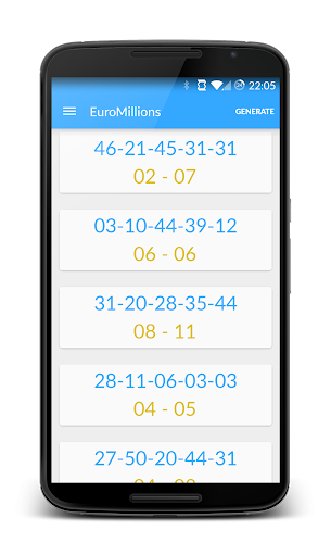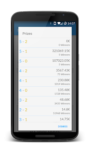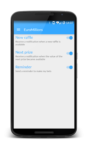 The EuroMillions receive push notifications to notify you when a new result is available, when the next Jackpot value is available and reminds you to make your bets.