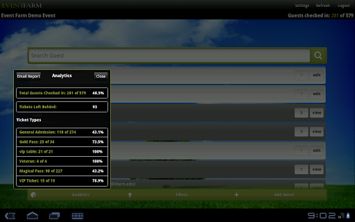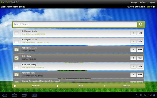 The Event Farm application is used for check-in and guest registration at events. The application can be used in conjunction with the web-based Event Farm Ticketing and Guest Registration System or can be used on its own for users that simply want to upload a guest list. The application allows users to check-in guests, leave behind tickets for others, view notes about individual guests (i.e seating assignments, etc) as well as trigger "Arrival Alerts" that email and/or text users when specific guest(s) have checked in.