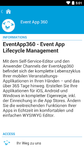 Für die Erstellung der eigenen App bietet die EventApp360 zahlreiche Funktionsmodule. Zur Konfiguration und Pflege der Inhalte steht ein Online-Editor zur Verfügung, in dem jeder Veranstalter Apps für die gängigen Betriebssysteme in Eigenregie erstellen kann. Bereits im Grundsystem sind zahlreiche Module der Premiumklasse enthalten, z.B. Barcodes, weitreichende Branding-Optionen oder mobile Sponsoring zur Refinanzierung. Außerdem werden die Integration von Multimedia-Dateien, das Versenden von Push-Nachrichten und ein Analyse-Tool zur Auswertung der Nutzung für jeden Kunden angeboten. Zusatzfunktionen, wie ein Interaktivitäts-Modul zur Durchführung von Live-Votings oder Networking-Funktionen für die Teilnehmer können auf Wunsch als Erweiterung der App bestellt werden. Laden Sie sich die App herunter um sich Ihre Kreation anzusehen!