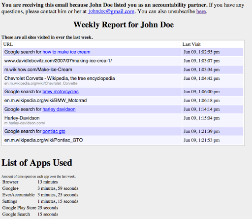 You can have your weekly report sent to up to 3 trusted friends. The reports contain the websites you visit, content viewed inside many popular apps, and a breakdown of the time spent in all apps. Reports are easy to read and pornographic websites and apps are automatically flagged.