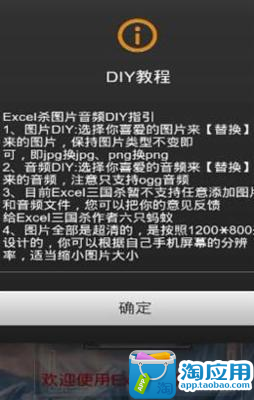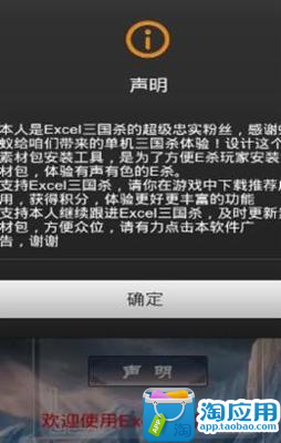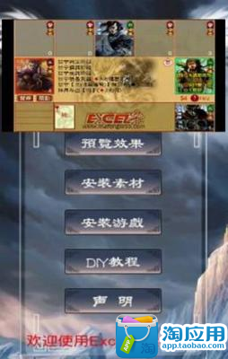Excel三国杀是六只蚂蚁独创的单机三国杀游戏,深得众多三国杀玩家的喜爱! M2.7.22版本在游戏中去除了所有的武将图片和音频,改为让玩家自己下载图片音频素材包,并有力的支持图片音频DIY。但是还是有很多人不方便使用电脑或手机来操作素材包的解压缩和拷贝操作。特意提供这个Excel三国杀图片音频素材包安装工具,为的是让Excel三国杀更方便玩家使用,让更多人喜欢Excel三国杀,强烈支持蚂蚁! 功能简介:图片效果预览、一键安装素材、DIY教程、直连马峰窝工作室网站获取最新游戏信息等。 -素材包使用指引:1、下载方式1:使用电脑下载Excel杀官方推荐图片音频素材包.zip,解压后把里面的ExcelSGS目录直接拷贝到手机的SD卡根目录下即可。2、下载方式2:直接使用手机下载Excel杀官方推荐图片音频素材包.zip,然后使用安卓系统的解压缩软件(可以到安卓应用市场寻找)解压缩到SD卡根目录即可。3、图片、音频DIY注意事项: 2.1 武将图片没有小后缀 _1200 _480 ,如曹操:jcaocao.jpg 2.2 图片和音频不允许修改扩展名