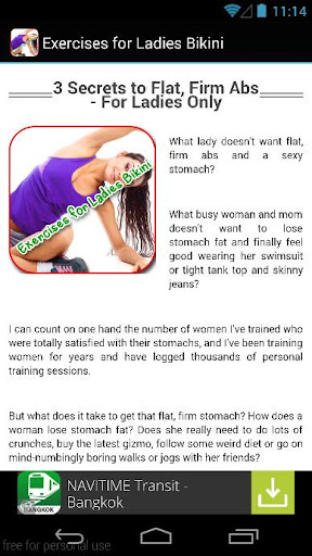 Need a guide for Exercises for Ladies right? Exercises is best one method way to burn your fat. if you have a good shape will make you wear any styles are beautifully. And one of those costumes is a bikini. Download Exercises for Ladies Bikini application if you need a good shape.