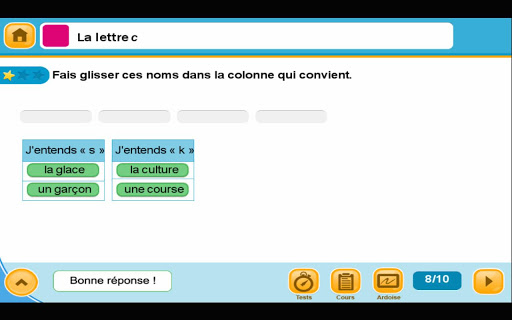 • 1 000 exercices permettant à l’enfant de varier son entraînement avec différents types d’exercices : cases à cocher, étiquettes à déplacer, texte à sélectionner ou à saisir, tableaux à compléter, etc.