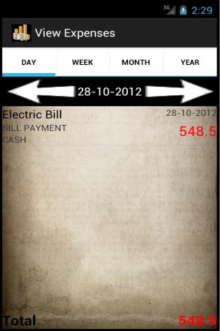 - A tab based UI that helps you view your expenses for a single day/week/month/year.