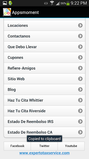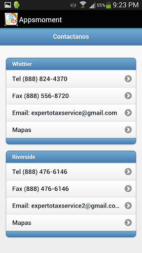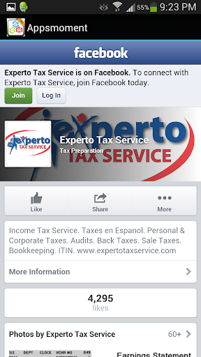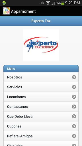 EXPERTO TAX SERVICE ESPANOL APP cuenta con funciones prácticas que le permiten encontrar la ubicación más cercana de Experto Tax Service utilizando el GPS de tu teléfono y llamar directamente con un solo clic. Enlaces a Experto Tax Service Facebook y Twitter para mantenerse informado en el dinámico mundo de los impuestos.
