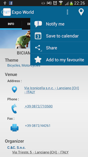 - Organize visits to the fairs by adding the events to the calendar with reminder system and a push notification request.