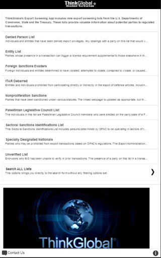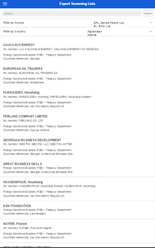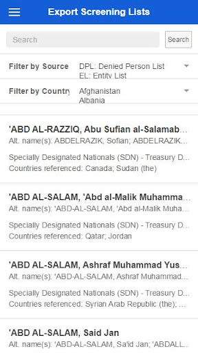 The Export Screening List helps verify potential parties to regulated U.S. transactions. The app consolidates data from nine export screening lists: Denied Persons List, Entity List, Unverified List, Nonproliferation Sanctions, ITAR Debarred List, Foreign Sanctions Evaders List, Palestinian Legislative Council List, Sectoral Sanctions Identifications List, Specially Designated Nationals List.
