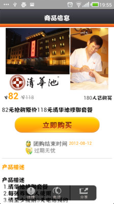 【软件基本介绍】 本软件是F团的移动客户端软件,方便用户在手机端浏览和购买F团的团购产品,启动后选择所需关注的城市,成功注册即可购买本软件在该城市的团购产品,购买成功后可以在“团购券”和“订单”中查看你的购买记录。本软件分类详细,支持排序功能,方便你的查看,还可以参加免费抽奖活动。 【主要功能特点】 1.首页 根据用户所选的地理位置,自动展示该城市的团购信息,并可以选择详细分类:美食、娱乐、生活服务、商品、酒店、旅游,还可以免费参加抽奖活动。 2.排序功能 您可以在每个分类中根据您的需要进行排序查看,支持按时间、按人气、按价格排序。 3.支付购买 您可以在移动端选择支付宝或财付通进行支付,也可以购买F币充值后使用F币进行支付,其提供者皆为国家审核通过的具有专业资质的网上交易平台