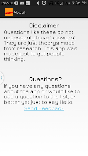 This app is a simple list of questions and answers to the common questions of life. I must say ad free of course. More questions can be submitted and added to the list in the next update. PLEASE keep in mine this is just for fun. Have fun ;)