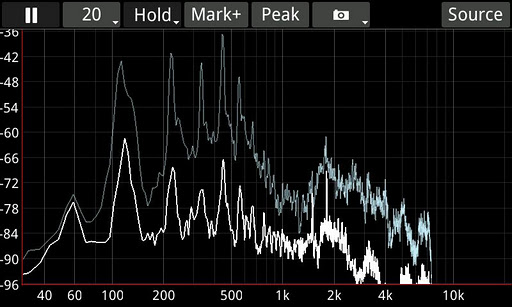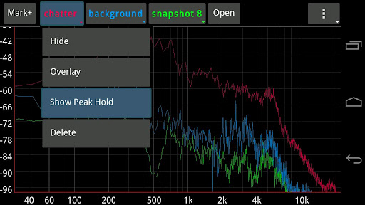 Take and name snapshots of the graph, and display several of them or overlay them with live data later to compare. Find feedback immediately with the peak finder, or monitor a specific frequency or two with frequency markers. Use whatever kind of averaging scheme fits your purposes best - featuring exponentially weighted averaging and unweighted averaging with configurable times. If you want a good overall trace of what's going into the microphone over time, turn on infinite averaging. It's all included in the app.