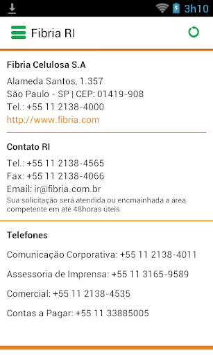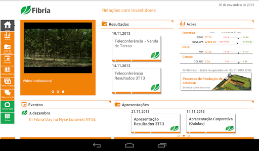 Este aplicativo foi desenvolvido com objetivo de fortalecer a relação de confiança, parceria e transparência entre a Fibria e investidores. Apresenta, em português e em inglês, os últimos comunicados, fatos relevantes, cotações, Relatórios trimestrais, Relatórios anuais, fotos, vídeos e demais informações sobre a empresa.