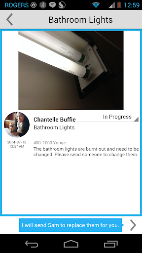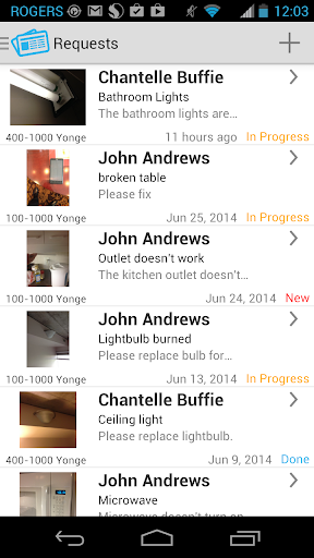 Tenants can submit repair requests to the Property Manager by taking a picture within the app, writing a short description of the issue, and pressing “send” all in a matter of seconds. The Property Manager will see a list of all issues from their tenants, organized by property and by unit, and can update a tenant on the repair status simply by selecting from a drop-down list. Tenants are automatically kept in the loop through push notifications.
