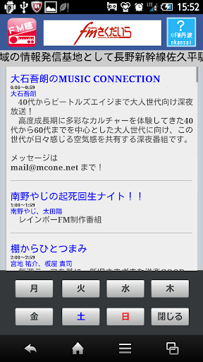 また、放送音声だけでなく放送中の番組の番組名、番組内容、ホームページ、twitter、地域の天気予報などを見ることができます。